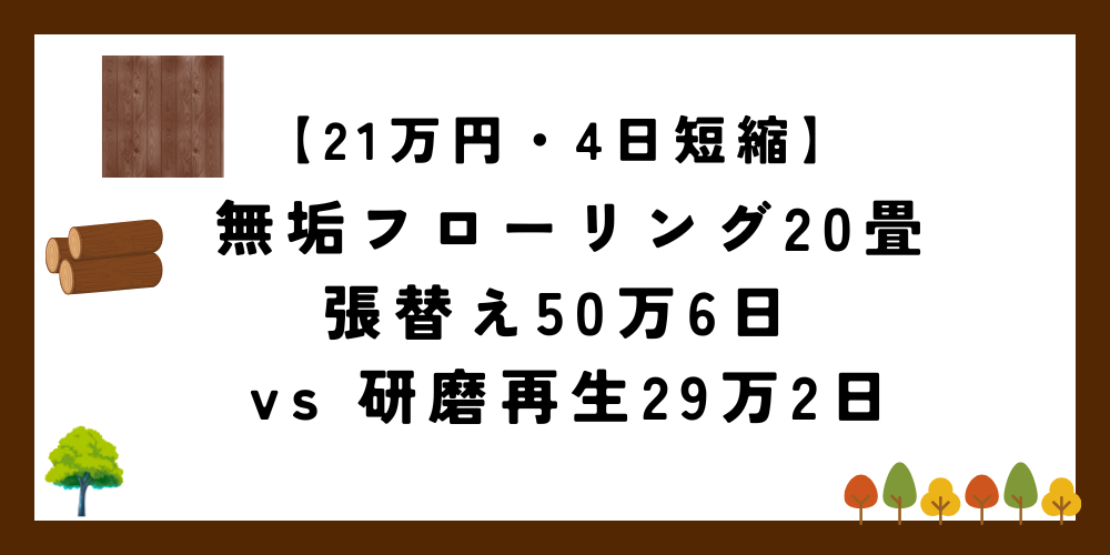無垢フローリング20畳|張替え50万6日 vs 研磨再生29万2日【21万円・4日短縮】